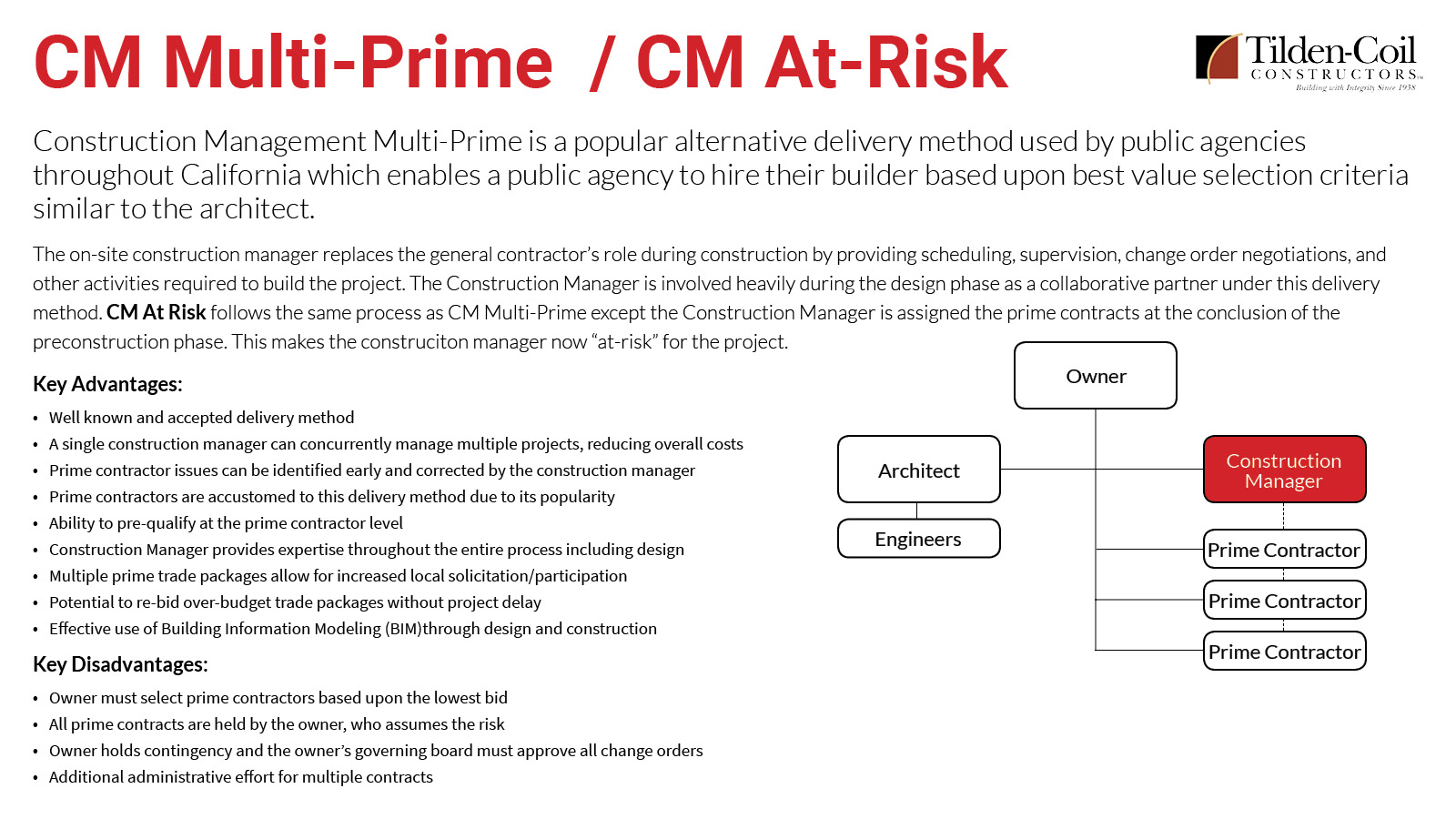 Based upon our clients’ preference, Tilden-Coil offers the following Construction Management Delivery Methods.