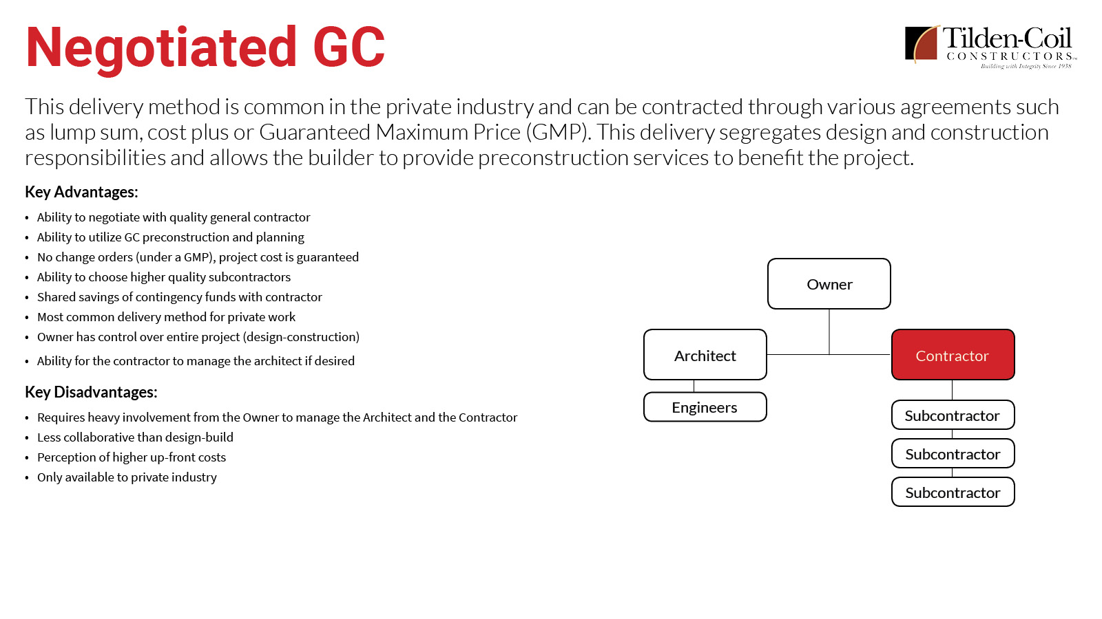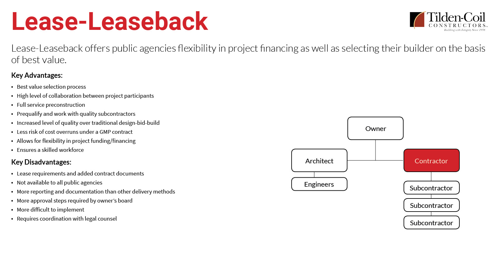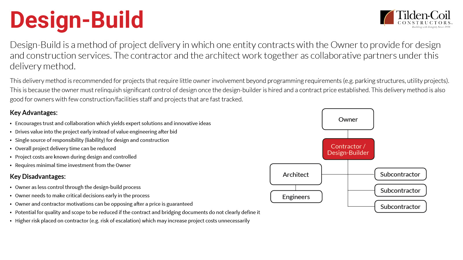 Another advantage this delivery method offers is the ability for a client to satisfy its needs for financing the project. Tilden-Coil can provide financing options for the new or renovation projects with various options on the term and method of repayment.