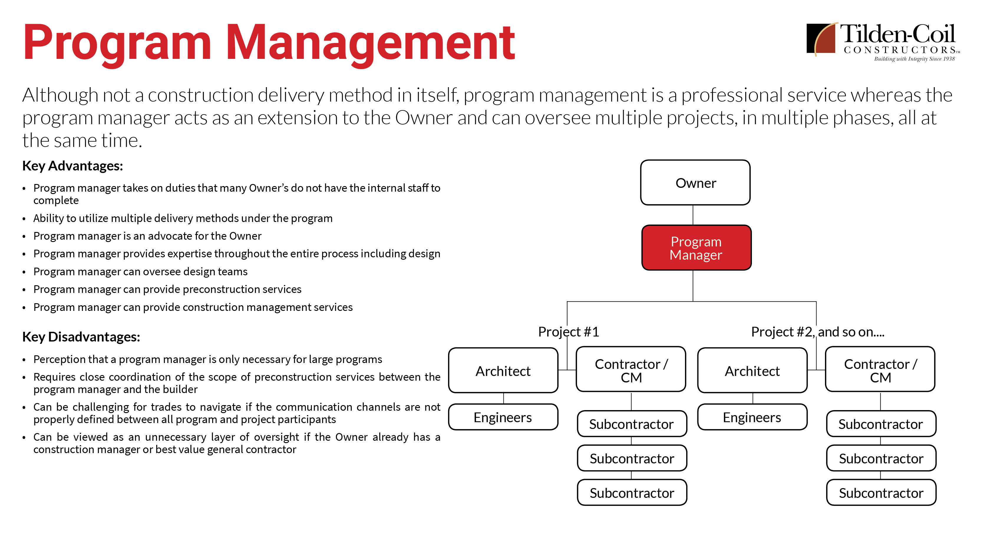 If you would like to learn more about what makes our Program Management Services different, please contact us for references on our current Program Management Projects. Each client has a unique story about how Tilden-Coil is serving their specific needs.